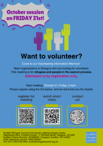 If you are interested in finding out about volunteering in charities (other than Scottish Refugee Council), you can attend one of our monthly Volunteering Information Afternoons.